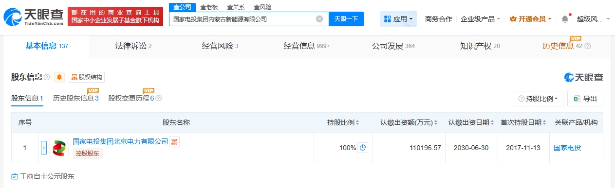 每经AI快讯,天眼查App显示,近日,国家电投集团内蒙古新能源有限公司发生工商变更,注册资本由约5.9亿元人民币增至约11亿元人民币,增幅约88%。该公司成立于2012年8月,法定代表人为高云龙,经营范围包括风力发电、太阳能发电、电力高新技术研发、电力设备的销售等。股东信息显示,该公司由国家电投集团北京电力有限公司全资持股。