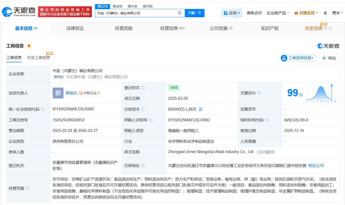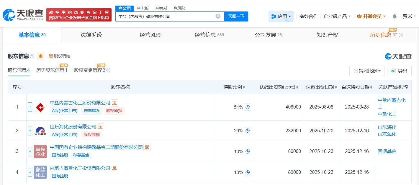 每经AI快讯,天眼查App显示,近日,中盐(内蒙古)碱业有限公司发生工商变更,新增内蒙古蒙盐化工投资有限公司、山东海化(000822)、中国国有企业结构调整基金二期股份有限公司为股东,注册资本由1960万元人民币增至80亿元人民币,增幅约40716%,同时,多位高管发生变更。该公司成立于今年3月,法定代表人为郭国庆,经营范围包括非煤矿山矿产资源开采、食品添加剂生产、饲料添加剂生产等,现由中盐化工(600328)及上述新增股东共同持股。