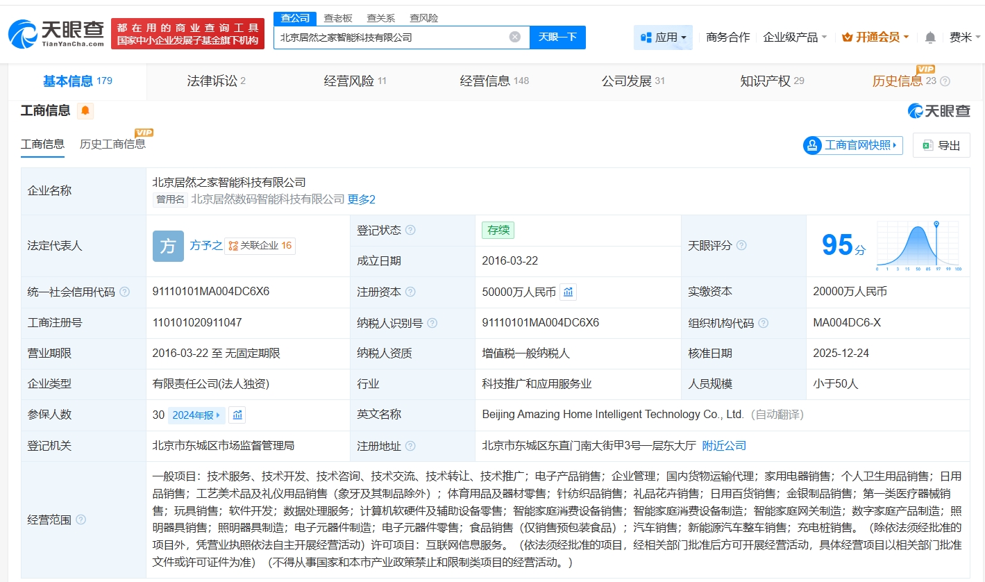 每经AI快讯,天眼查App显示,近日,北京居然之家智能科技有限公司发生工商变更,注册资本由2亿人民币增至5亿元人民币,增幅150%。该公司成立于2016年3月,法定代表人为方予之,经营范围包括电子产品销售、企业管理、国内货物运输代理等,由居然智家(000785)旗下北京居然之家家居连锁有限公司全资持股。