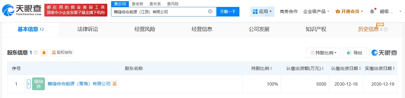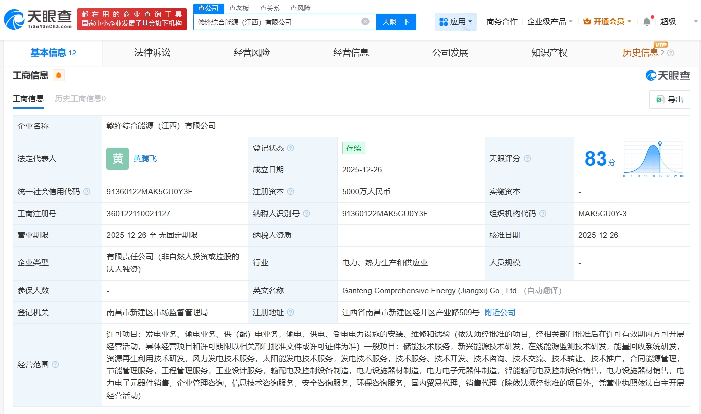 每经AI快讯,天眼查App显示,近日,赣锋综合能源(江西)有限公司成立,法定代表人为黄腾飞,注册资本5000万元人民币,经营范围包括储能技术服务、新兴能源技术研发、在线能源监测技术研发、能量回收系统研发等。股东信息显示,该公司由赣锋锂业旗下赣锋综合能源(青海)有限公司全资持股。