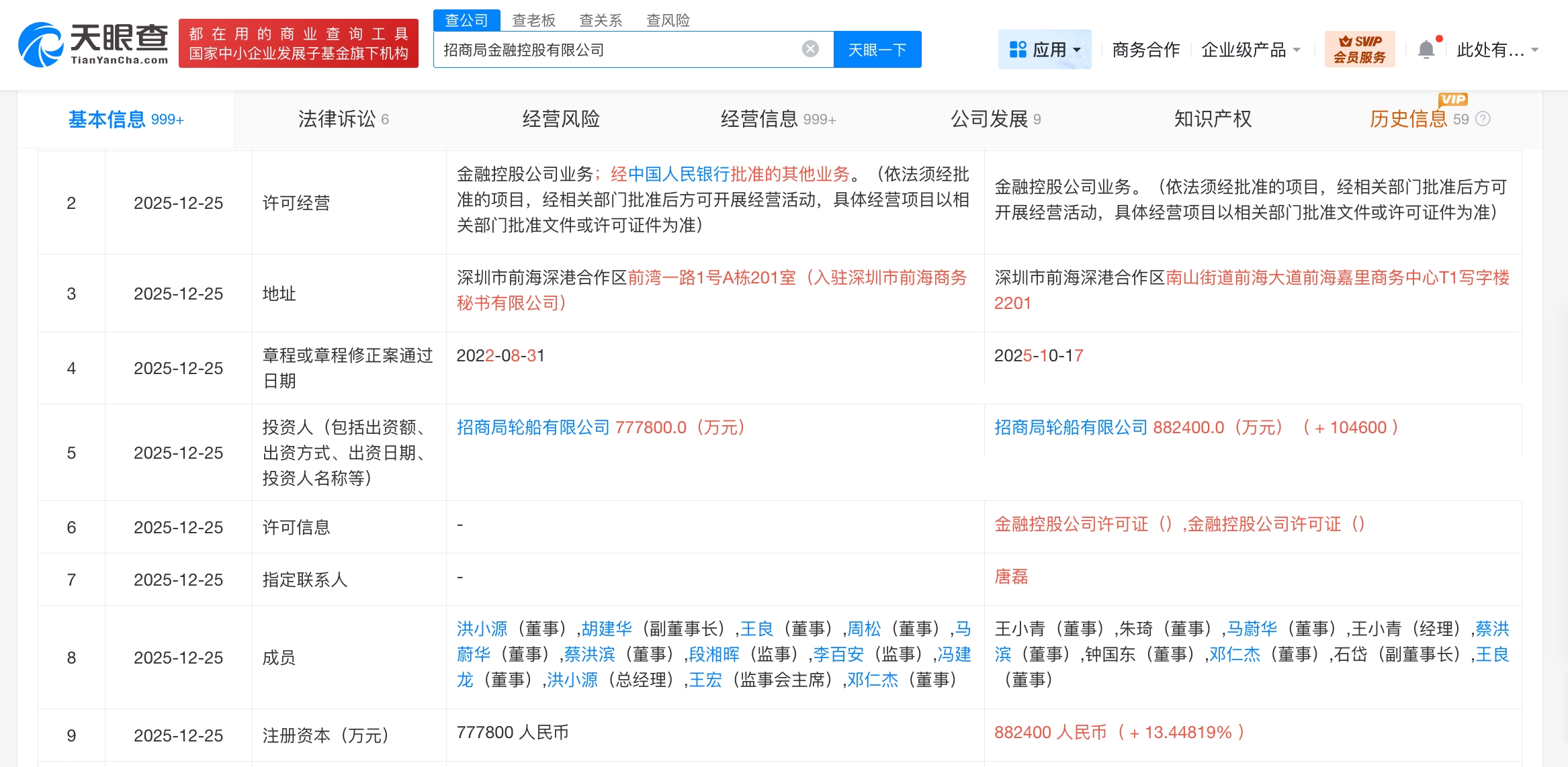 每经AI快讯,天眼查工商信息显示,近日,招商局金融控股有限公司发生工商变更,注册资本由77.78亿元人民币增至88.24亿元人民币,增幅约13%。该公司成立于1997年5月,法定代表人为缪建民,经营范围为金融控股公司业务。股东信息显示,该公司由招商局轮船有限公司全资持股。