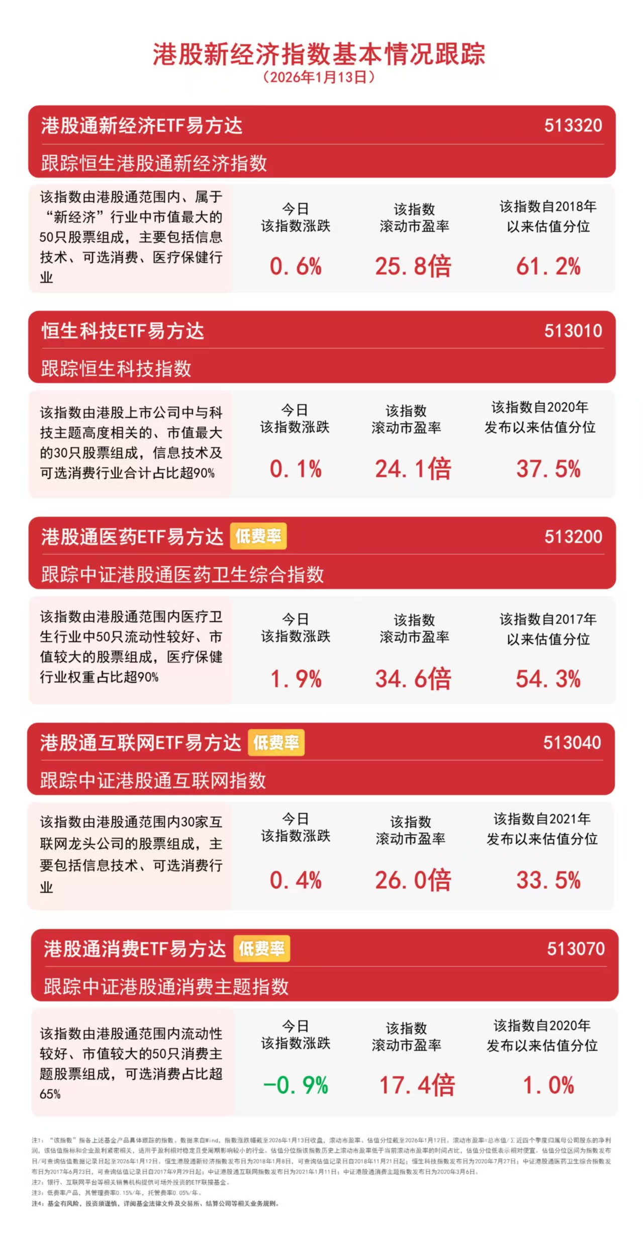 截至收盘,中证港股通医药卫生综合指数上涨1.9%,恒生港股通新经济指数上涨0.6%,中证港股通互联网指数上涨0.4%,恒生科技指数上涨0.1%,中证港股通消费主题指数下跌0.9%。港股医药板块相关ETF交投活跃,其中港股通医药ETF易方达(513200)全天成交额超2.5亿元,较昨日显著放量。